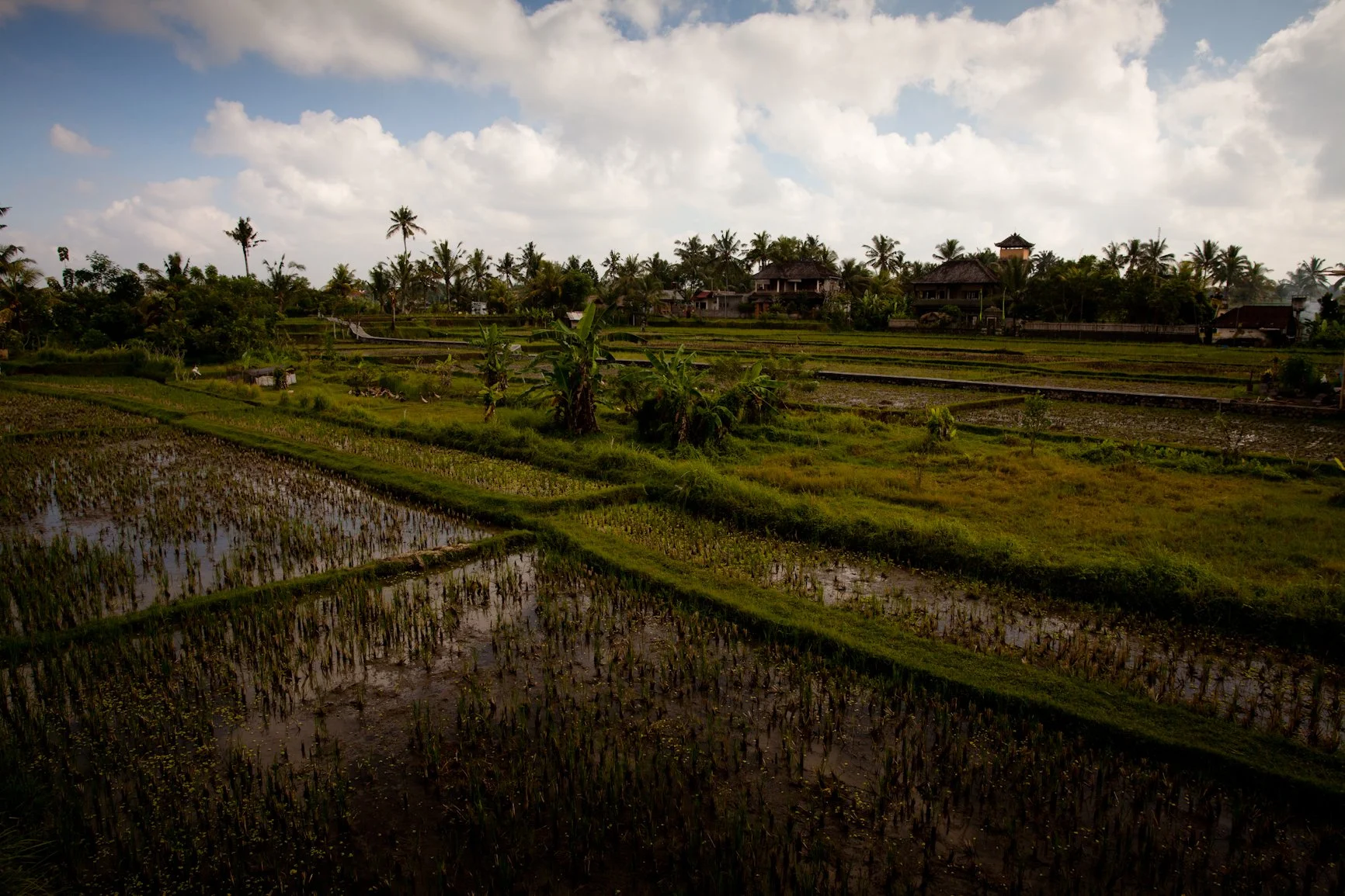 A lush green terraced rice field landscape with scattered palm trees and some houses in the background under a partly cloudy sky.