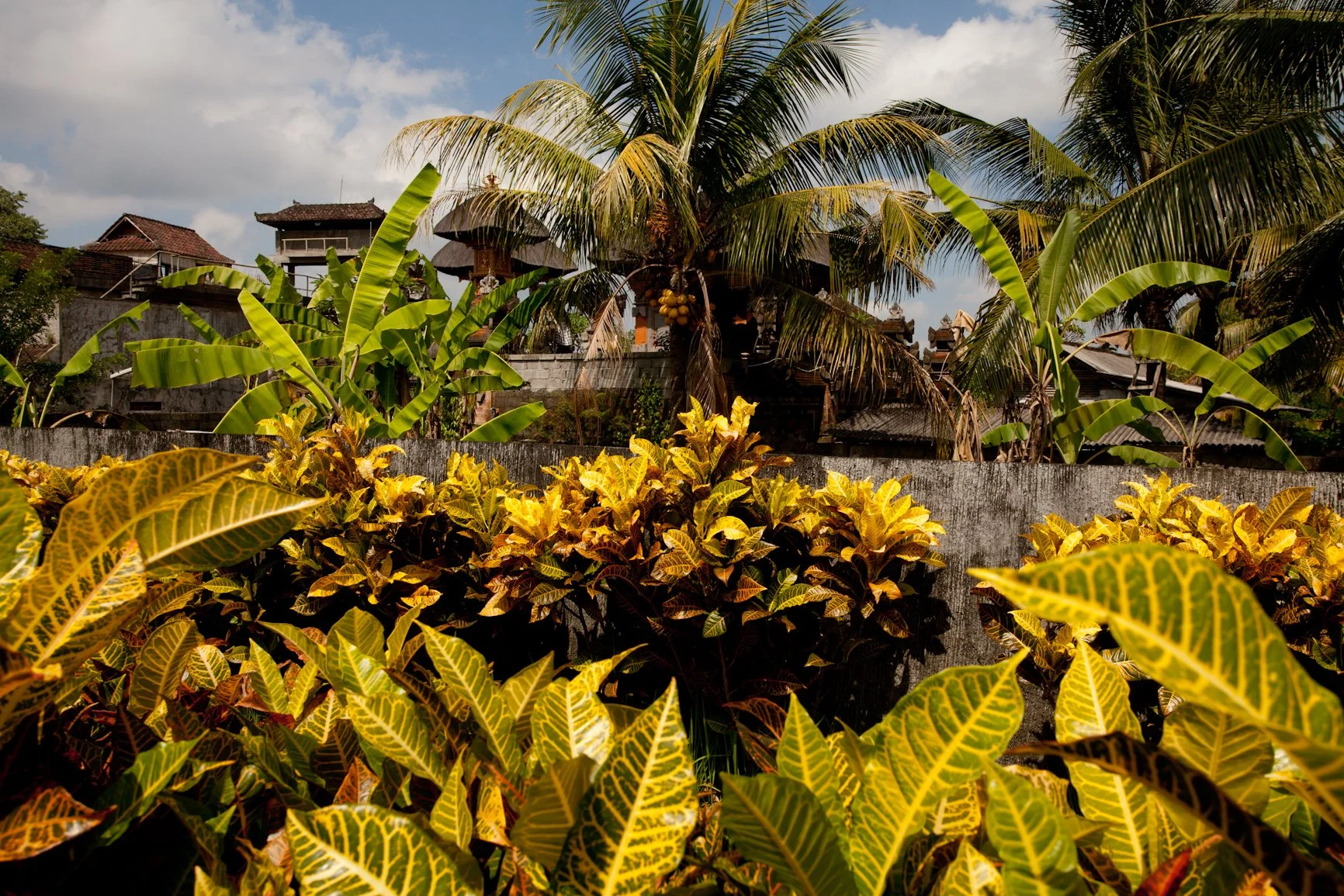 Tropical garden with yellow, green, and brown leafy plants, banana trees, and palm trees, with houses and cloudy sky in the background.