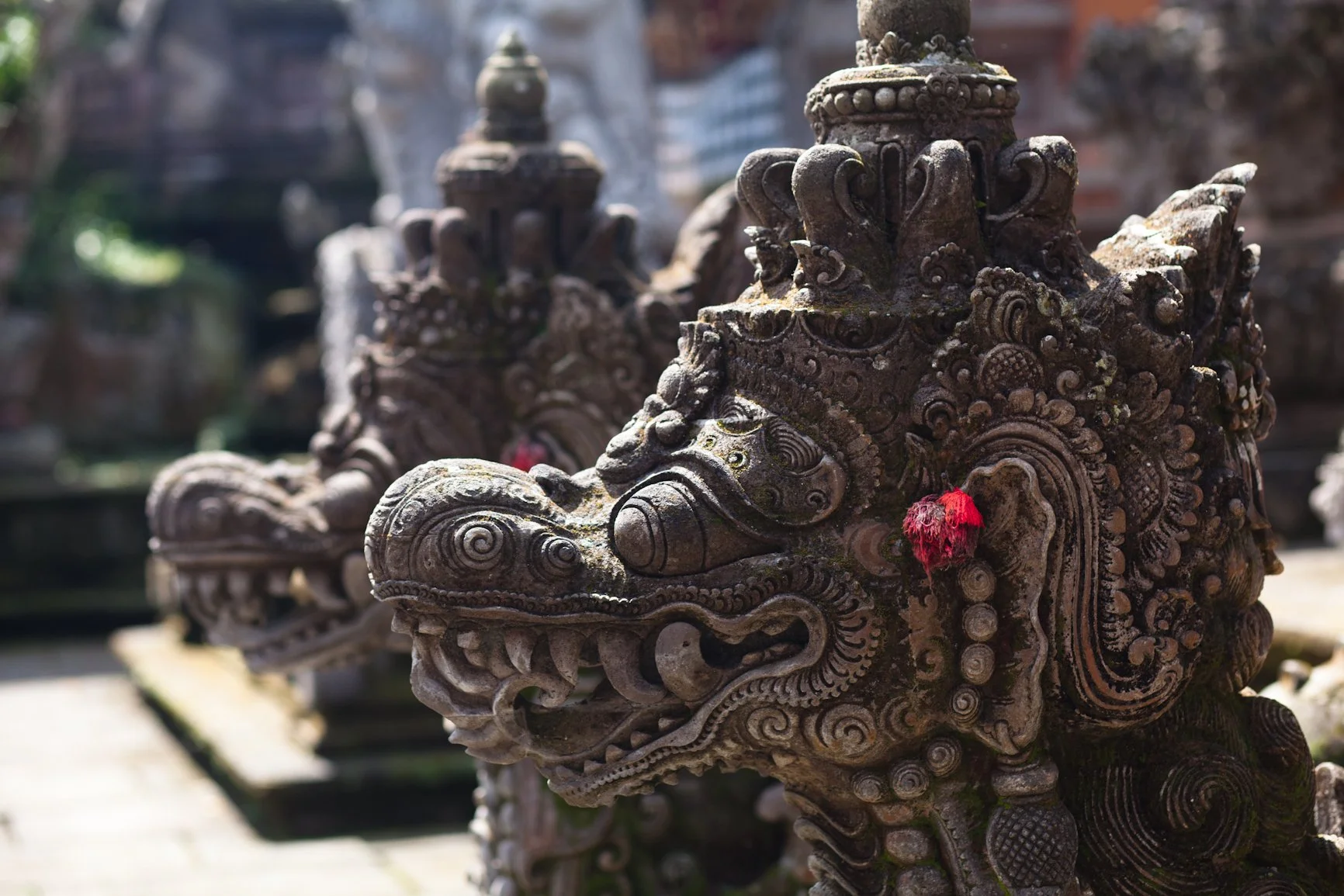 Stone sculpture of a dragon figure with intricate carvings and a small red flower attached.
