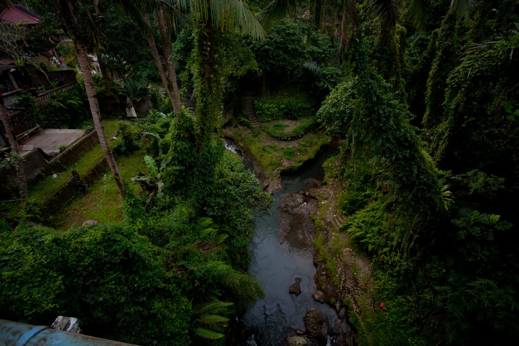 A lush, green tropical forest with a narrow river running through it, surrounded by dense vegetation and tall trees.