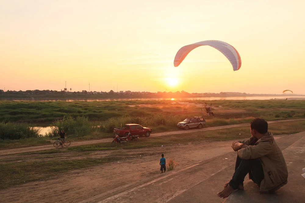 A man sitting and watching a sunset with a paraglider flying in the sky, cars, bicycles, and people on a dirt path near a river or wetland area.