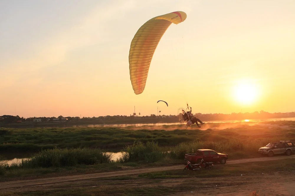Paraglider flying in the sky over a grassy area near a river at sunset, with a white pickup truck parked on the ground below.