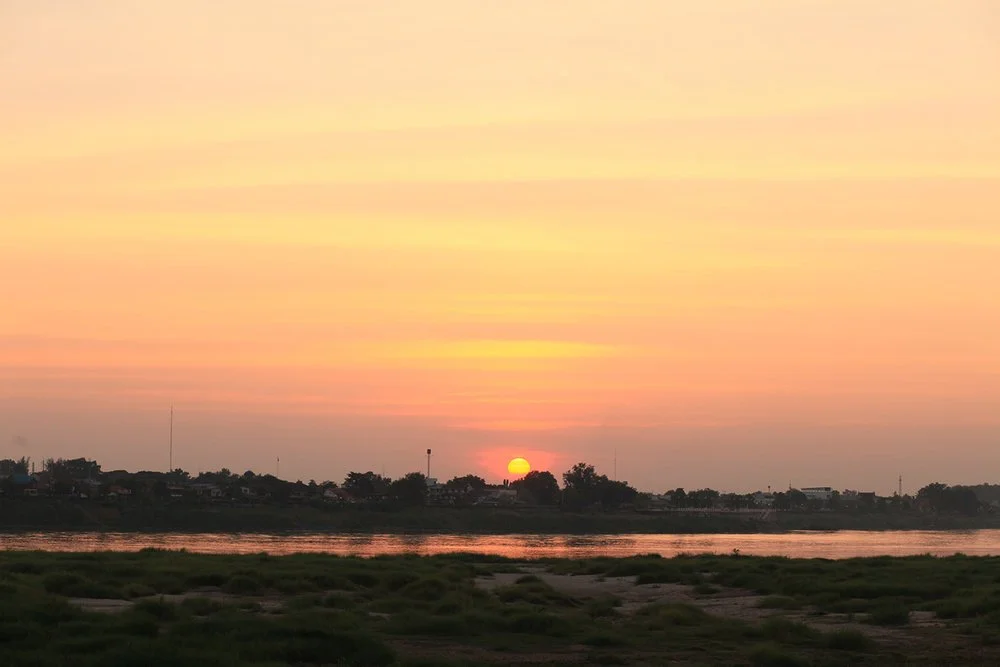 Sunset over a river with a distant shoreline and trees, with pink and orange sky