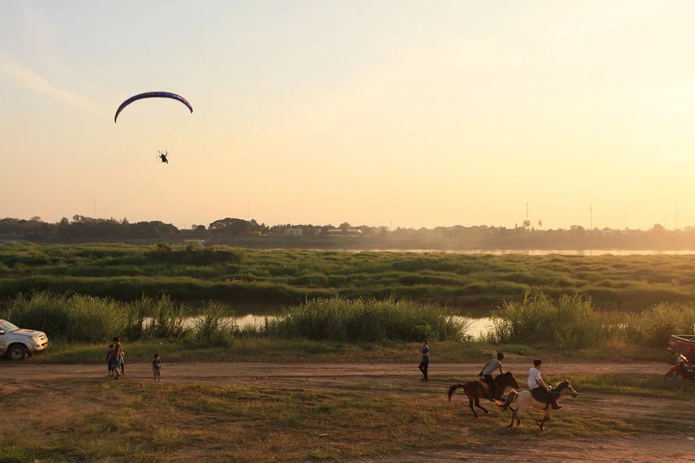 A paraglider flying above a rural landscape with a lake, trees, and grassy fields, with people riding horses, walking, and vehicles parked nearby at sunset.