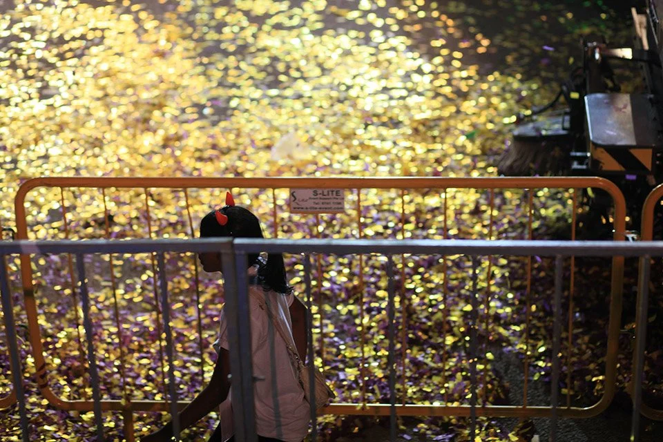 A girl standing behind a barricade at night, with a body of water covered in floating yellow and purple leaves reflecting city lights in the background.